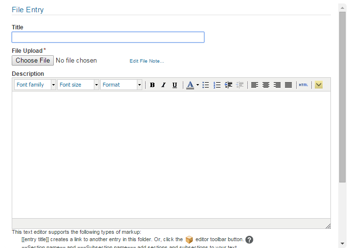 For example, the form for a File entry is what users see when they are creating a File entry. Users access this form by clicking New File Entry in a Files folder. It looks like this: