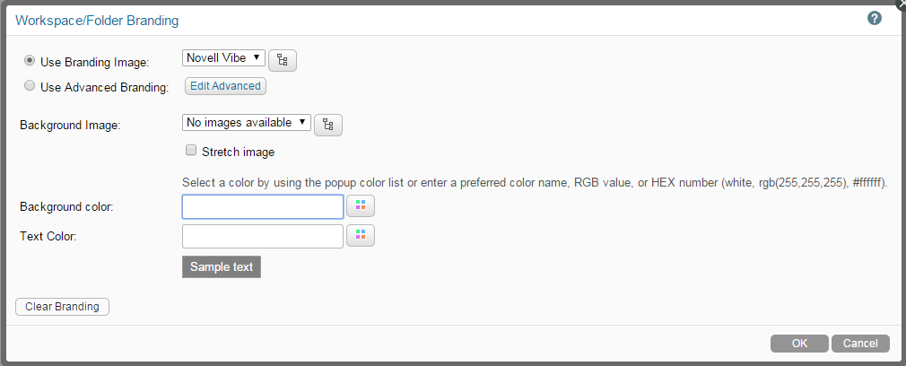 Text Color: Changes the text color of the workspace name in the upper right corner of the branding area. To change the text color, click the color name to the right of this field, select the new color, then click OK.