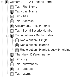 For the W-4 application, the standard title and buttons are not needed (the custom JSPs provide these elements). So, use the entry designer to delete the and elements from the form definition. Next, add the and elements. This is the appearance of the form definition when you are finished: