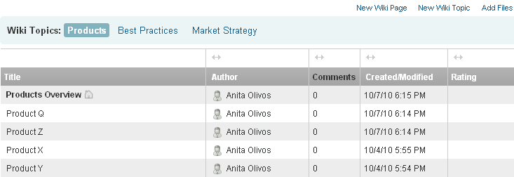 You can organize your Wiki pages (Wiki entries) into separate Wiki Topics (Wiki folder and Wiki sub-folders). Wiki Topics are displayed in the tab, in the section. Also, in the Navigation panel, you can expand your Wiki folder to view your Wiki Topics.