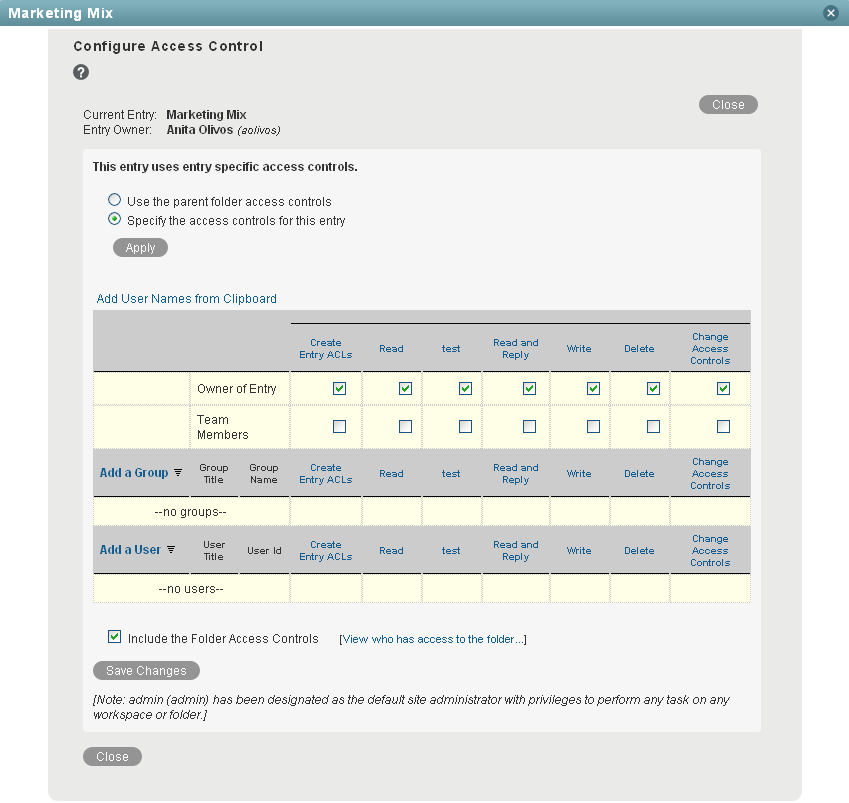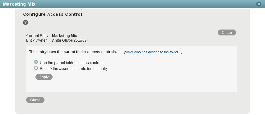 Deselect if you want the new entry-level access controls to override the folder-level access controls. If you deselect this option, you must use the entry-level access controls to specify each user or group that you want to have access to the entry. Users who have access to the folder that contains the entry but have not been granted access rights to the entry itself do not have access to the entry.
