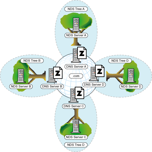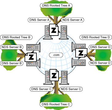 To maintain reliability of DNS data, zone information can be replicated through zone transfers from primary master servers to other primary slave servers. These servers act as backups in case something happens to one of the other servers. As shown in Figure 40, each node is an object that can hold information. In DNS, the information is limited to addresses for services or aliases to other objects. NDS eDirectory, on the other hand, can store a wide variety of information and thus can be used as a general repository. The intent of DNS integration is to allow NDS objects to also become DNS objects. This has the following benefits: