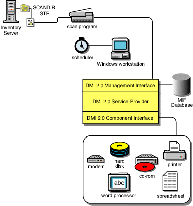 The scanners for scanning workstations (Windows 95/98 and Windows NT/2000) also include scanning based on the industry-standard Desktop Management Interface (DMI) specification 2.0. These programs use the Management Interface (MI) of DMI to look for the hardware components installed on the workstation. The scanners will scan for specific components that are instrumented on the workstation through DMI. The scanners will query the DMI service layer to retrieve this information.