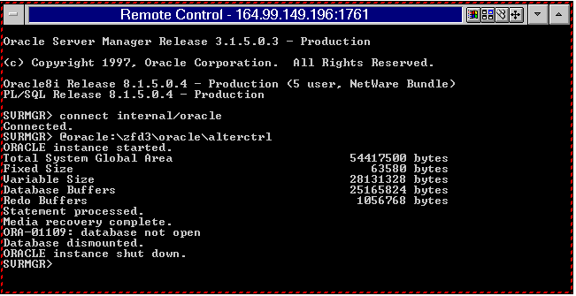 Connect as an administrator. For example, if the administrator's internal name is internal, at the Server Manager prompt, enter connect internal/password_for_administrator. Enter shutdown normal. At the Server Manager prompt, enter @complete_path_of_alterctrl.sql\ALTERCTRL. You should see the following window, which indicates that the database is mounted and loaded.