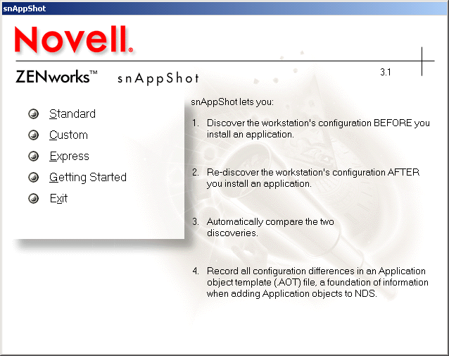 On the clean and representative workstation (see Preparing a SnAppShot Workstation), start snAppShot (SNAPSHOT.EXE) from the SYS:\PUBLIC\SNAPSHOT directory.