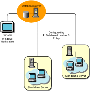 In this type of inventory configuration, the inventory server components and database are located on a Standalone Server. The Standalone Server is an inventory server with an Inventory database. There is no roll-up of data and the Sender-Receiver components are not used. This scenario is illustrated in the following figure.