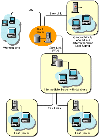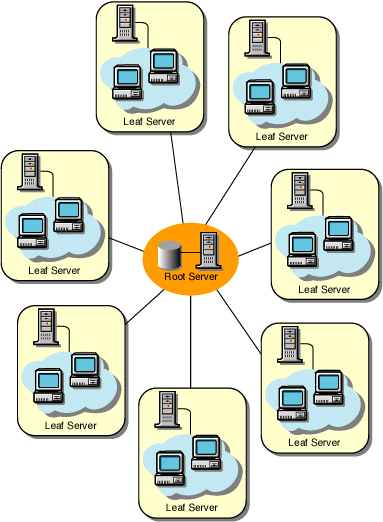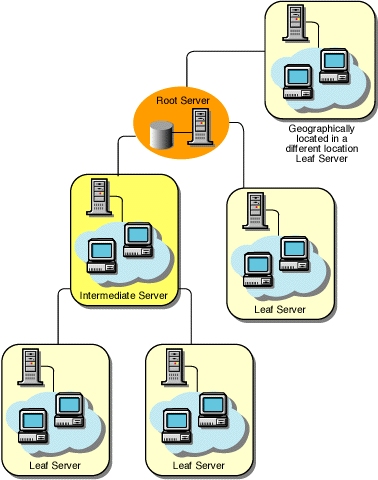 In this configuration, the Leaf Servers roll up data to the next-level Intermediate Server and finally to the Root Server. Another server at a different location is also connected to the Root Server.