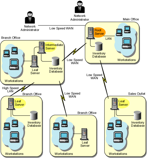 All inventory servers are connected to a central enterprise database server. The Leaf Servers do not have a database and Intermediate Servers are not required.