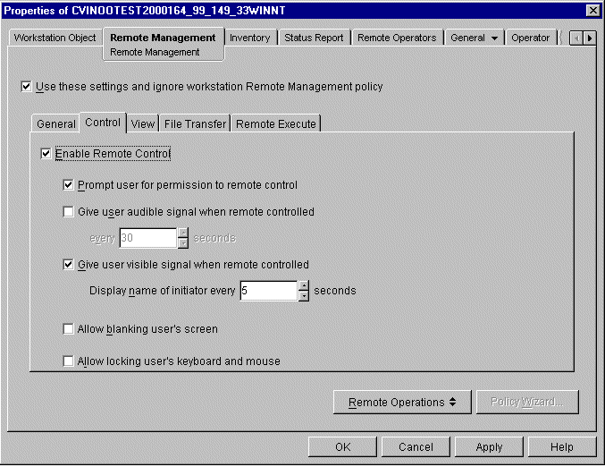 The following figure displays the Remote Control security options available from the Remote Management policy.