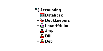 All you need to do is drag the User object named Amy onto the Organizational Unit object named Accounting. Then you select the rights you want Amy to have and click OK. Now Amy has rights to manage the Database application, the Bookkeepers group, the LaserPrinter printer, and the User objects Amy, Bill, and Bob.