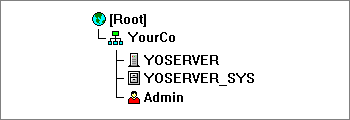 The picture below shows the default NDS tree for a small network. It has the required [Root] object, an Organization named after your company, a server (named YOSERVER in this example), a volume (named YOSERVER_SYS in this example), and a User object named Admin.