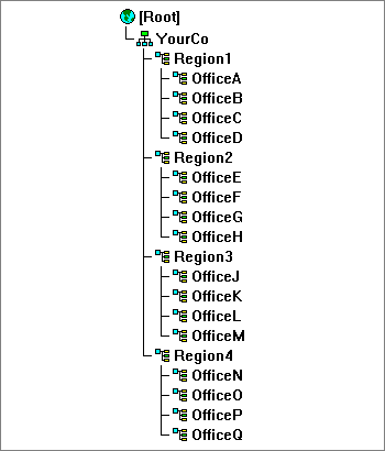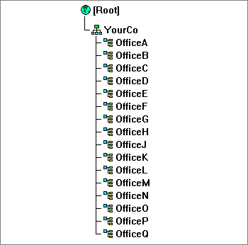 In organizations with numerous branch offices, you might naturally create a flat tree, with numerous Organizational Units under the Organization. A sample flat tree is shown below.