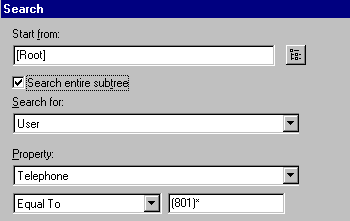 Searching and browsing the Directory rely greatly on the consistency of property values. For instance, the NWAdmin Search window below shows a search for User objects with a telephone number beginning with '(801).'