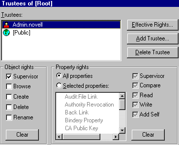 Create only applies when the target object is a container. The target in the example above is [Root], shown in the window's title bar. Create allows the trustee to create new objects below the container, and also includes the Browse right.