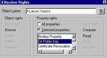 A user's effective rights to an NDS object are calculated each time the user attempts an action. NWAdmin checks the effective rights of any object and displays them for you, as shown below.