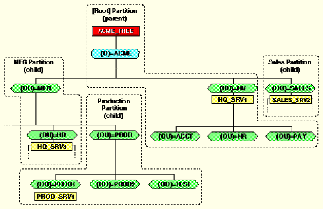 The following graphic shows a typical tree structure. Note how the Sales Organizational Unit is a partition. This could be because the Sales OU is across a WAN link, or because it has a large number of User objects in it.