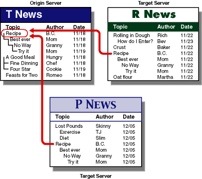 The following illustration shows one post in the origin server and two cross-posts in the target servers.