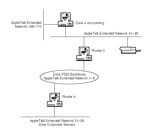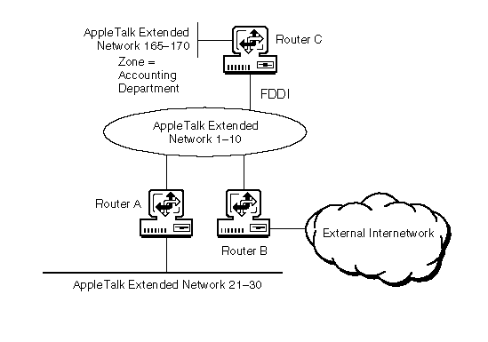 In the following example, the Accounting department is connected to the FDDI backbone by Router C. One of the AppleTalk networks within Accounting is 165-170. Because access to this network from outside the Accounting department is not required, the administrator has chosen not to propagate a route to this network outside the Accounting department. Figure 8 shows the internetwork topology.
