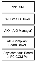 To run PPP over asynchronous ports, such as your PC's COM ports, you must use a board driver that is compliant with the AIO standard. An AIO-compliant driver can communicate with the AIO Manager (AIO.NLM), which then communicates with the WHSMAIO driver. The WHSMAIO driver converts the AIO character stream into the asynchronous HDLC framing service required by the NetWare Link/PPPTM software. WHSMAIO also converts PPP asynchronous HDLC frames into an AIO character stream. Finally, the WHSMAIO driver provides a WHSM interface with the PPP Data-Link layer (PPPTSM.NLM). The relationship of these modules is shown in Figure 8.