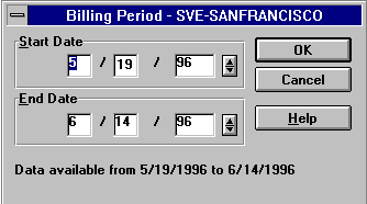 To access accounting data, select the desired server icon in the View All window or a View window, or select the desired server name in the Server combo box in the left corner of the Tool Bar. Then, either click the Accounting icon or choose Accounting > View Billing Charges by User Name. ConnectView opens the Billing Period dialog box, shown in Figure 43.