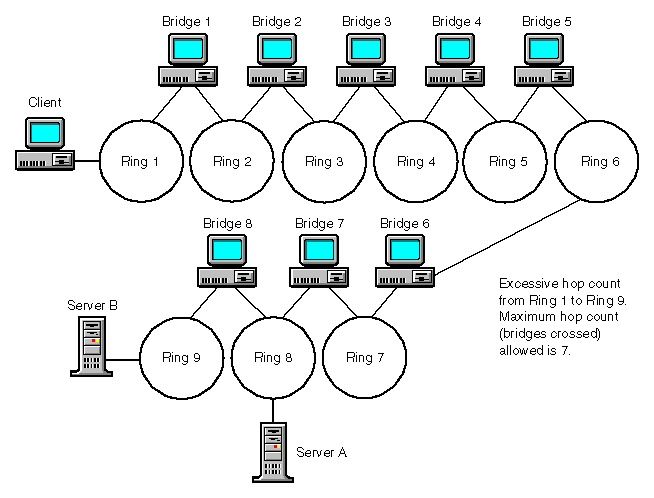 For example, in Figure 11 , Server A is seven hops away from the client, but Server B is more than seven hops away from the client. IPX RIP lets the client from Ring 1 log in to Server A and see Server B through the SLIST command. However, because the bridges are configured to discard packets more than seven hops away, the client cannot log in to Server B.