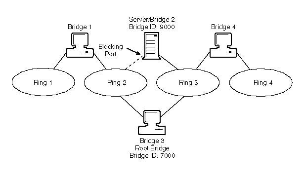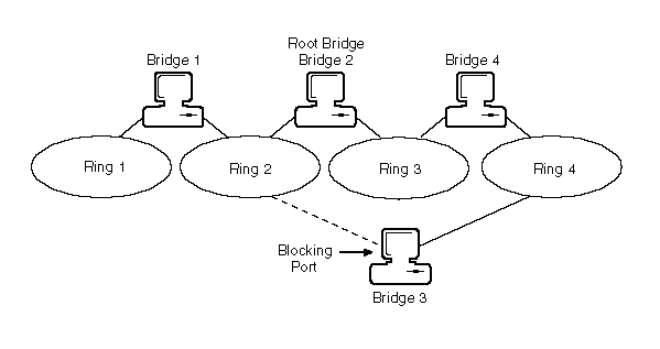 There are two port states: forwarding and blocking . When a bridge interface has been configured for forwarding, the port forwards single-route explorer frames to the attached network segment. An interface that has been configured for blocking does not forward single-route explorer frames to the attached network segment. The Spanning Tree Protocol automatically assigns port states to create a single data path and eliminate loops. As shown in Figure 2, one port of Bridge 3 has been placed in a blocking state (the port connected to Ring 2). The designated bridges for Ring 2 are Bridge 1 and Bridge 2 (the root bridge).
