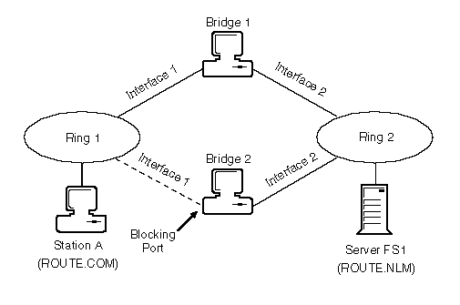 The Spanning Tree Protocol does not set all bridged interfaces automatically on a single Novell router to blocking mode. For clients and administrators to have access to bridged print/file services, network management, or other applications, at least one interface to each source route bridge must be able to forward packets.