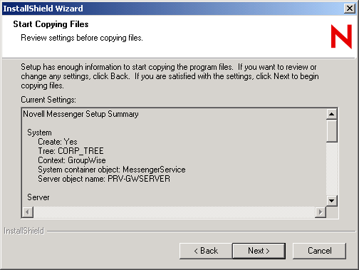 If you are running the Messenger Installation program at a Windows workstation or server, make sure that you are logged in as an Admin equivalent to the eDirectory tree where you are planning to create your Messenger system. If you are installing the Messaging agents on a Windows server, you should run the Installation program at that server.