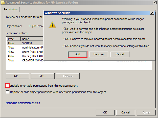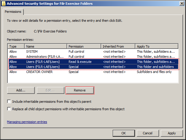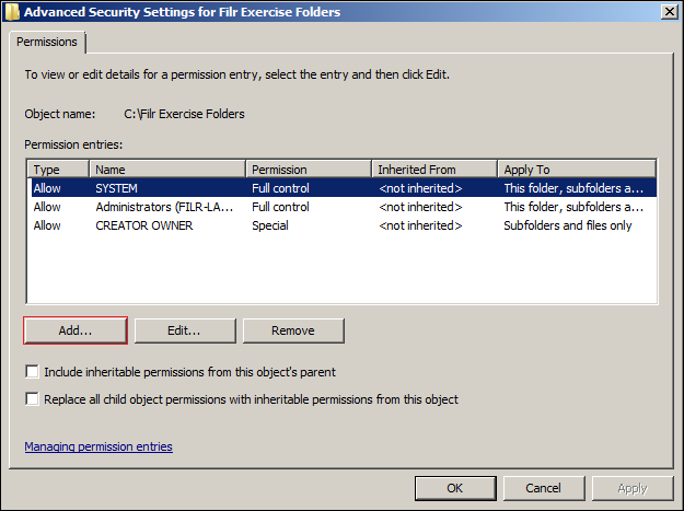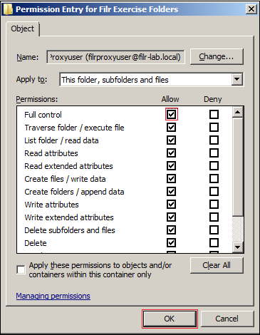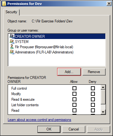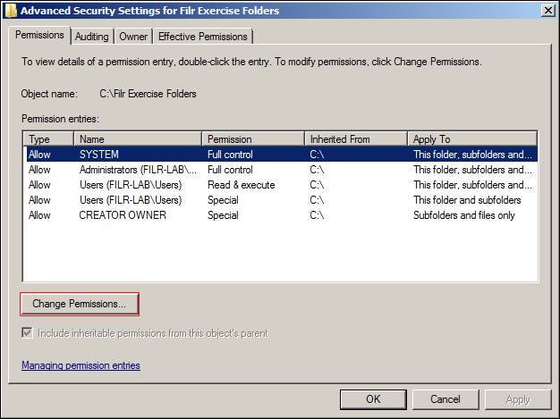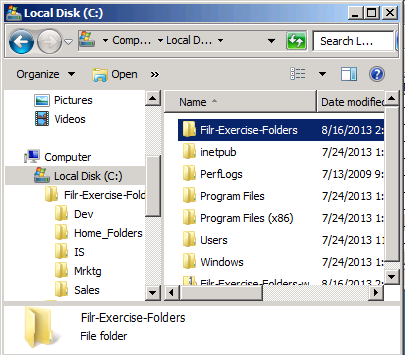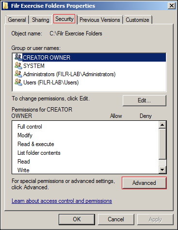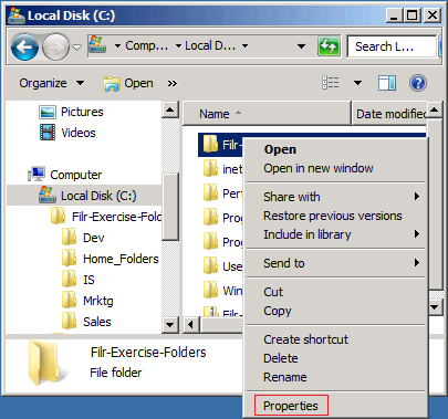 Adjust NTFS permissions to the Filr_Exercise_Folders folder by doing the following:
