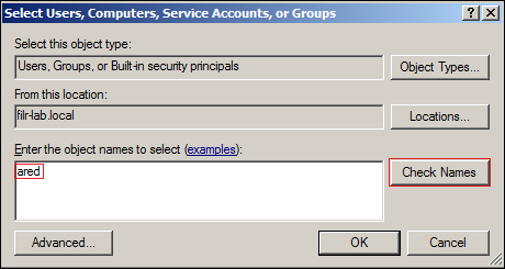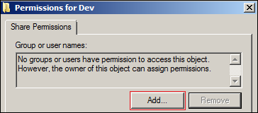 Referring to Table 5-2, type the user (object name) to assign full permissions to the directory (ared is for Dev), then click .