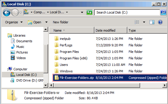 Copy the Filr-Exercise-Folders.zip file that you downloaded in Section 3.0, Downloading Filr Software, to on your Windows server.