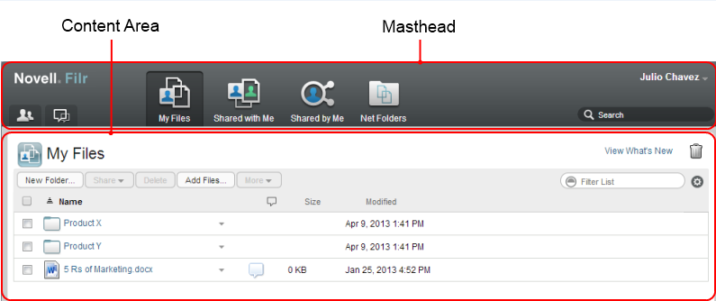 The Content Area in Filr is where the majority of information is displayed.
