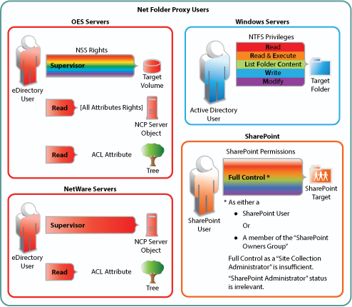 The Net Folder Server proxy user is used to read, write, create, and delete files on your corporate OES, NetWare, Windows, or SharePoint 2013 file servers on behalf of users who do not have native rights to the files, but have been granted rights via a Share in Filr.