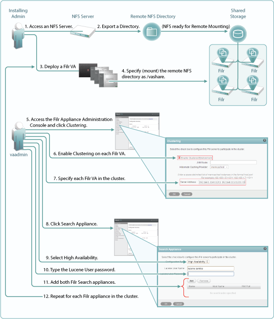 Filr clustering involves two or more Filr VAs sharing the same NFS data storage location (/vashare). Basic steps for setting up Filr clustering are included in Figure 1-1.