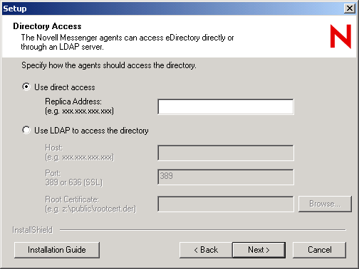 The access method chosen during installation applies initially to how the Messenger agents access eDirectory to obtain their configuration information. If you want to change this method, see Changing the eDirectory Access Method for Starting the Messaging Agent