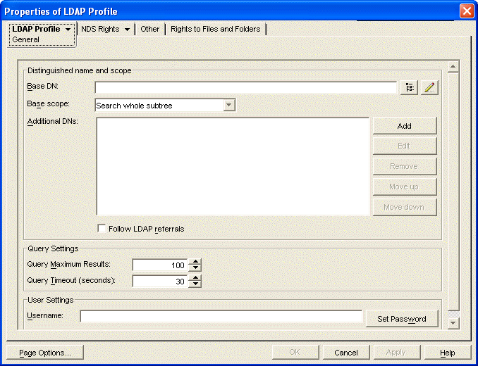 Additional DNs: If your eDirectory tree includes User objects that are located outside of the base DN, list other DNs as needed. The additional DNs are searched in the order listed.