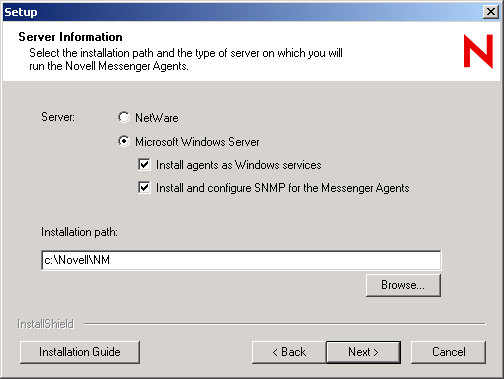 Rerun the Messenger Installation program, using the Install Server option as described in the Novell Messenger 2.2 Installation Guide, noticing that the Install and Configure SNMP for the Messenger Agents option is now available and selected.