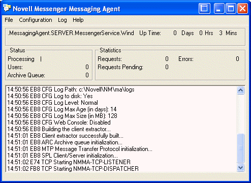 Messaging Agent log files are created in the /var/opt/novell/log/messenger directory. The Messaging Agent can be monitored using the agent Web Consoles from your browser, as described in Using the Messaging Agent Web Console.