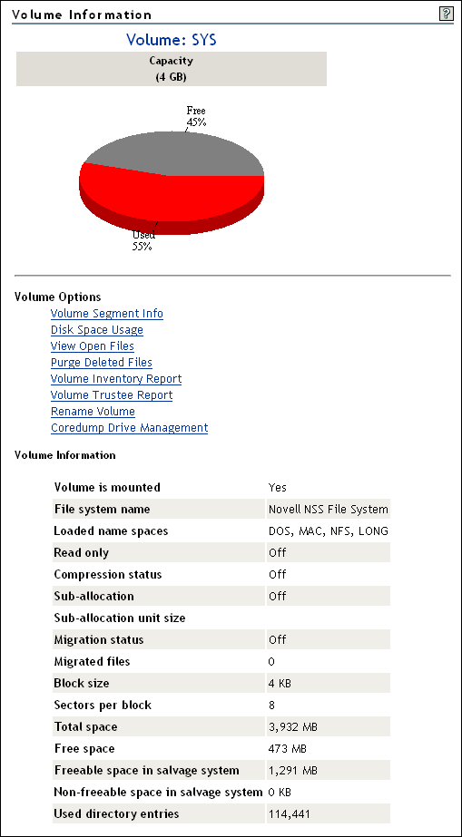The Volume Management page provides a list of the server's volumes and access to the server's DOS partitions. For procedures that you can do from this page, see the following sections: