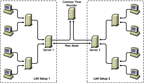 To minimize network traffic, configure two servers, on either side of the network, in either the peer-to-peer mode or the client-server mode. These two servers can either have their own external sources or be self-synchronized.