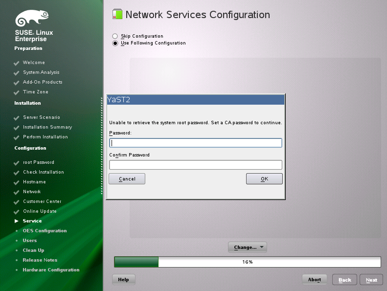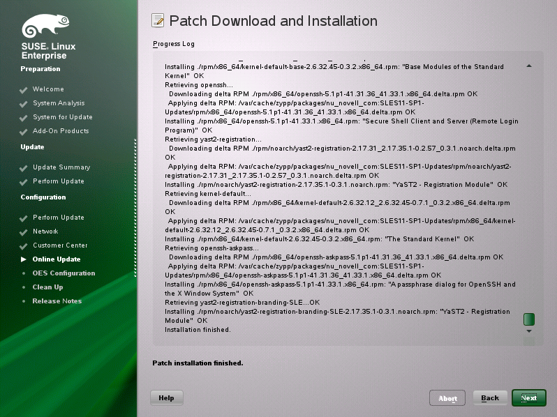 IMPORTANT:Do not skip this test. For a successful install, you must configure the Novell Customer Center and update SLES 11 SP4 from the patch repository before configuring OES services.