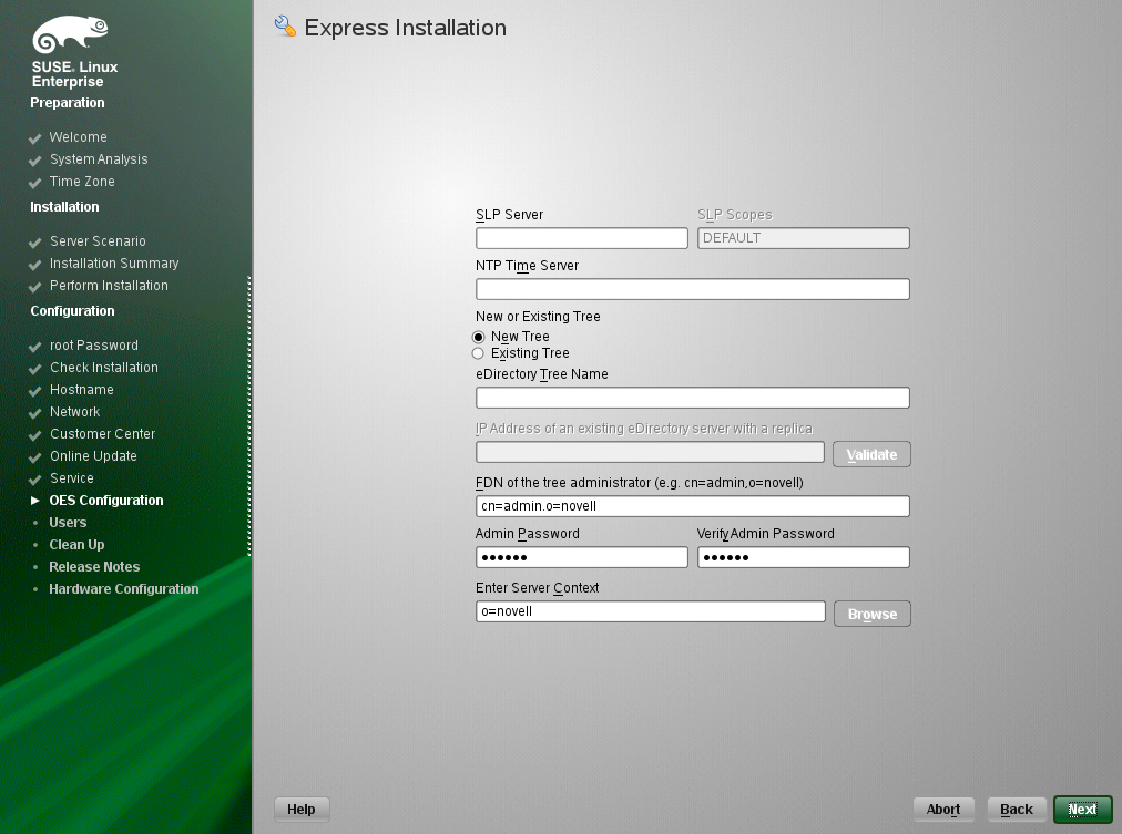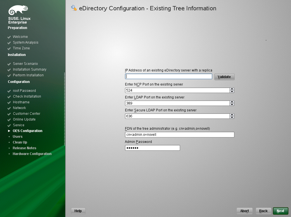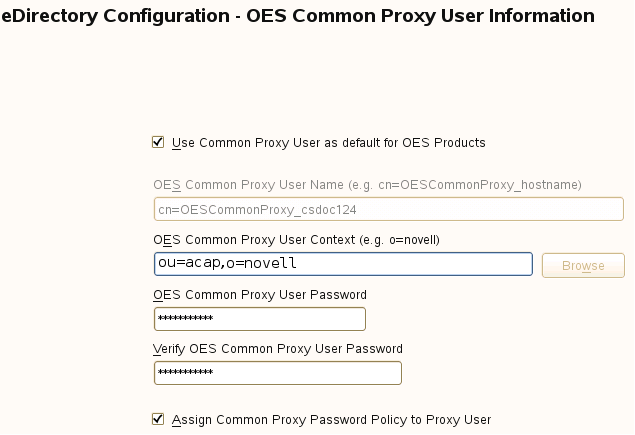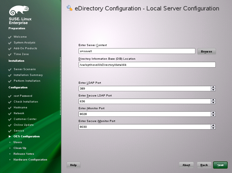 IMPORTANT:You specified the eDirectory configuration for this server in either Specifying LDAP Configuration Settings or Specifying eDirectory Configuration Settings, and the settings you specified were extended to your OES service configurations by the OES install.