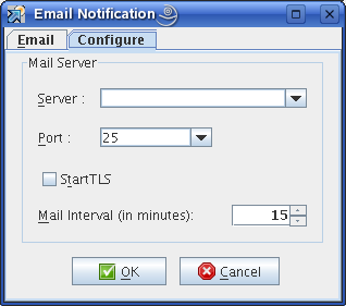 Specify the mail interval (in minutes) to send e-mail messages for errors encountered. The default time is 15 minutes, but you can increase or decrease the interval as necessary. The e-mail messages are sent only if error notification in the tab is set and if errors are encountered.
