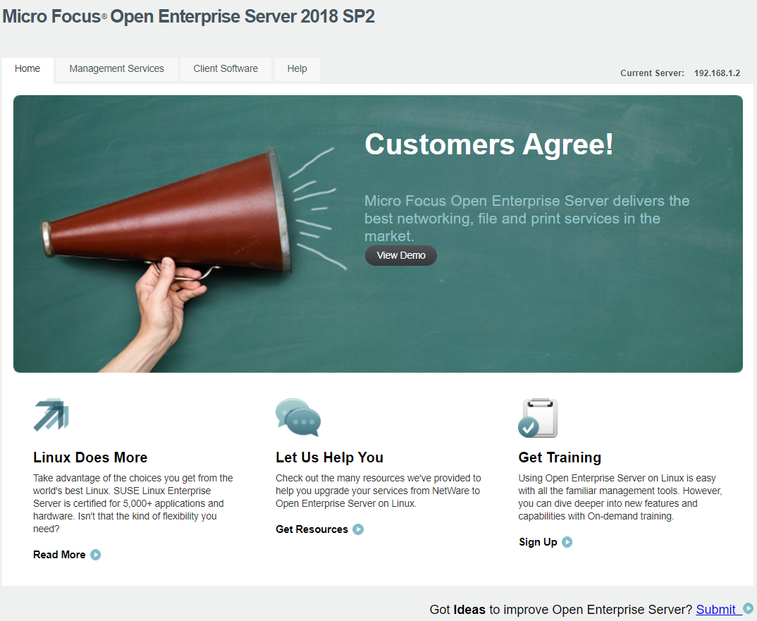 (Optional) If you want to look at the eDirectory tree and begin to see how iManager works, go to the OES Information and Management web page, click Management Tools > iManager, then log in as user Admin (the user you created during product installation).