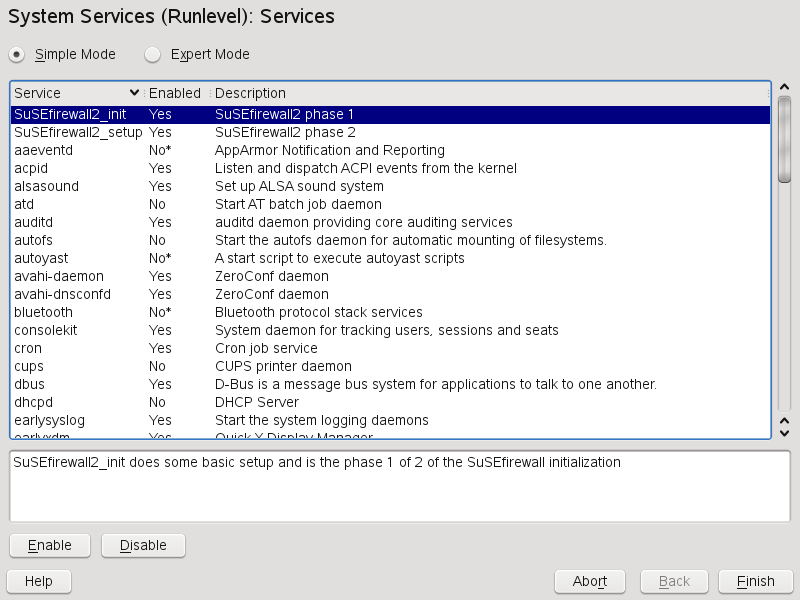 After starting this YaST module with , it displays an overview listing all the available services and the current status of each service (disabled or enabled). Decide whether to use the module in or in . The default should be sufficient for most purposes. The left column shows the name of the service, the center column indicates its current status, and the right column gives a short description. For the selected service, a more detailed description is provided in the lower part of the window. To enable a service, select it in the table then select . The same steps apply to disable a service.