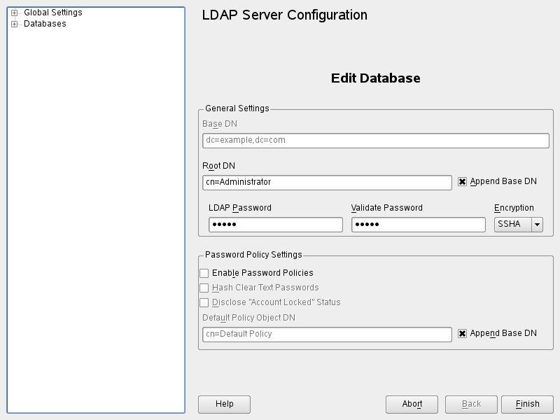 If you have not opted for password policies, your server is ready to run at this point. If you chose to enable password policies, proceed with the configuration of the password policy in detail. If you chose a password policy object that does not yet exist, YaST creates one:
