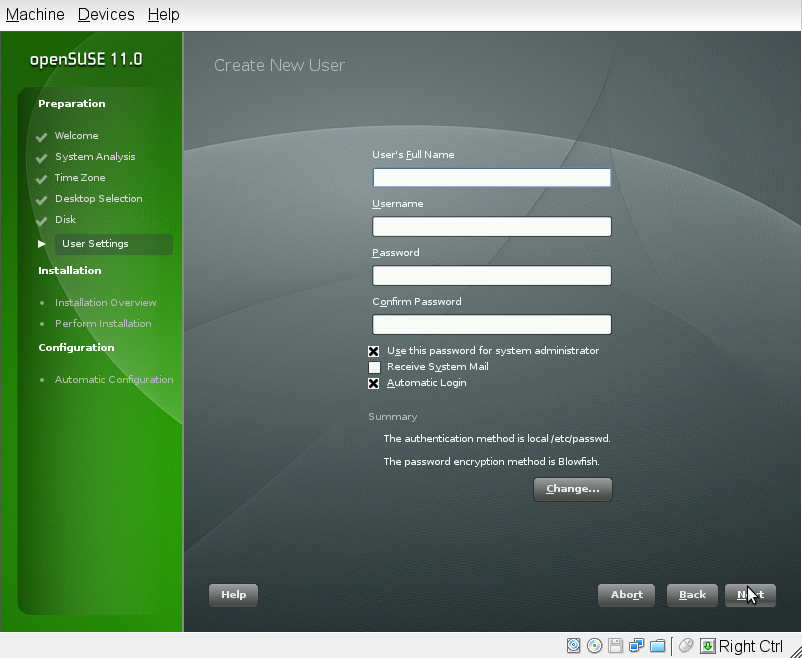 Create a local user in this step. Administrating local users is a suitable option for stand-alone workstations. If setting up a client on a network with centralized user authentication, click and proceed with the Section 1.11.1, Expert Settings.