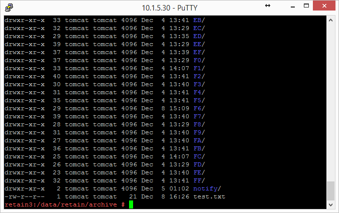 Change to the new archive directory. It should have 256 subdirectories (00 - FF). All those subdirectories must have the ownership of tomcat tomcat.