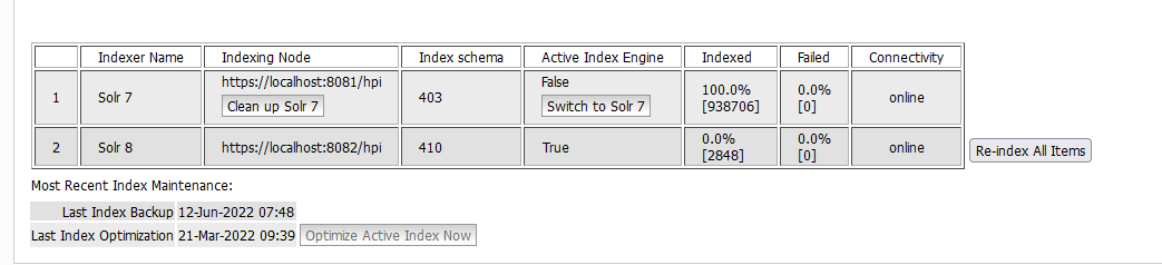 IMPORTANT:Once Solr 8 is configured, index optimization and backup are disabled until Solr 7 is cleaned up.