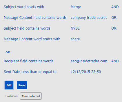 When building complex search criteria, it is critical to know what you are looking for. For instance, if an insider trading tip was suspected, and the recipient was known as well as some details about the message and when it must have been sent by, the following search could be compiled: